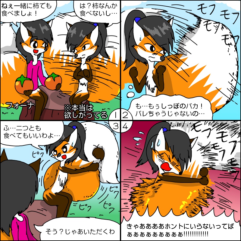 本当は柿を食べたいという自分の本心を隠そうとするも、しっぽの動きでバレちゃうツンデレキツネちゃん。